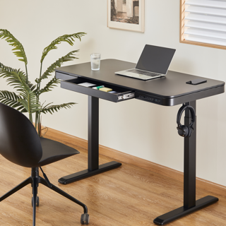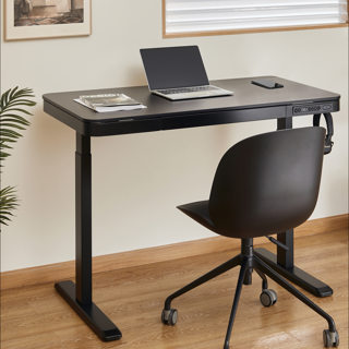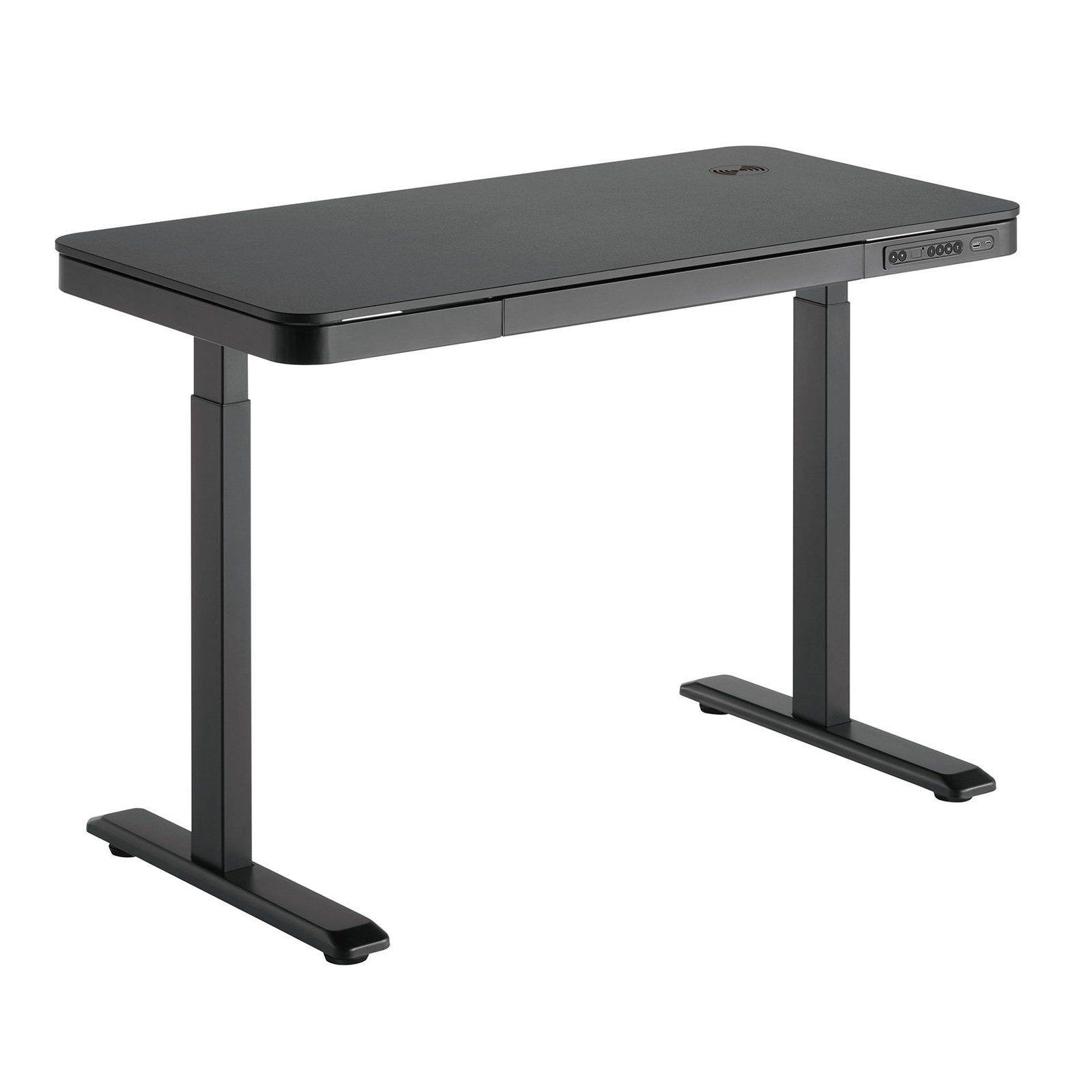 Bureau motorisé assis-debout 118x60cm avec tiroir et chargeur sans fil, Plateau Noir/Pied Noir